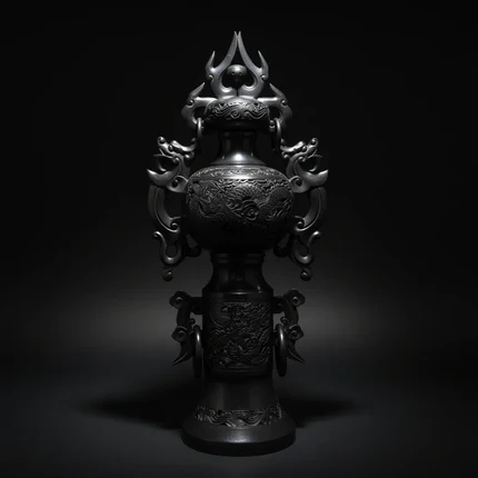 Shaped by fire and hand, it stands in deep black, solemn and mysterious. The crowned top, reminiscent of ritual vessels from a forgotten dynasty, rises with quiet majesty.